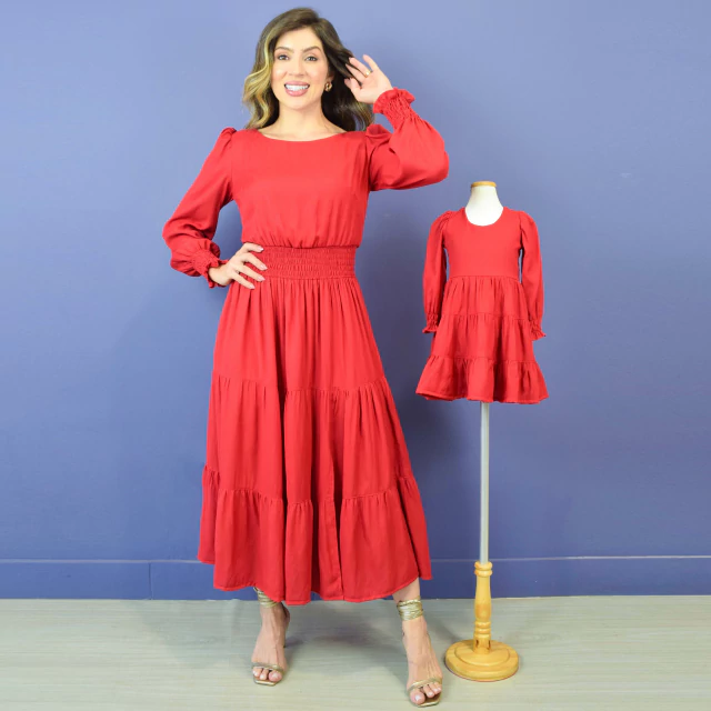 Este kit maravilhoso mãe e filha conta com um vestido adulto supermidi, costas com zíper invisivel garantindo a segurança do modelo, detalhe de lastex na cintura que encaixa perfeitamente no corpo e dá um toque de sofisticação, manga longa com detalhe em lastex no punho que torna o modelo ainda mais atraente. E um vestido infantil manga longa, ziper nas costas que garante o conforto e a segurança da sua pequena e detalhe em lastex e babado no punho que da todo um toque especial ao modelinho.
