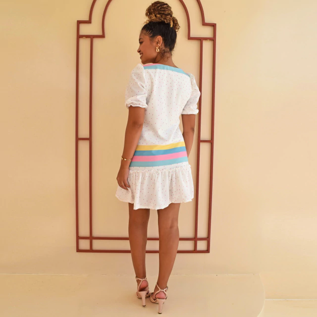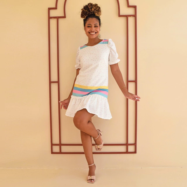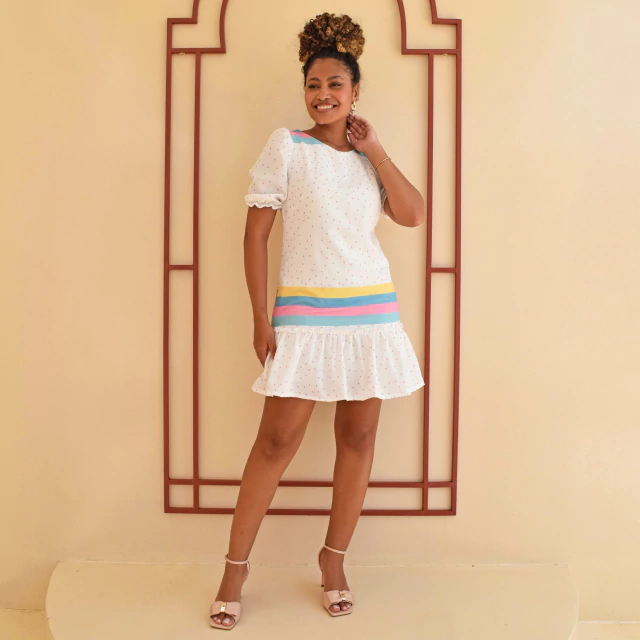 Vestido adulto curto modelo batinha soltinho no corpo. Manga curta com detalhe franzido na ponta e no babadinho da saia que dá todo um charme ao modelo.
