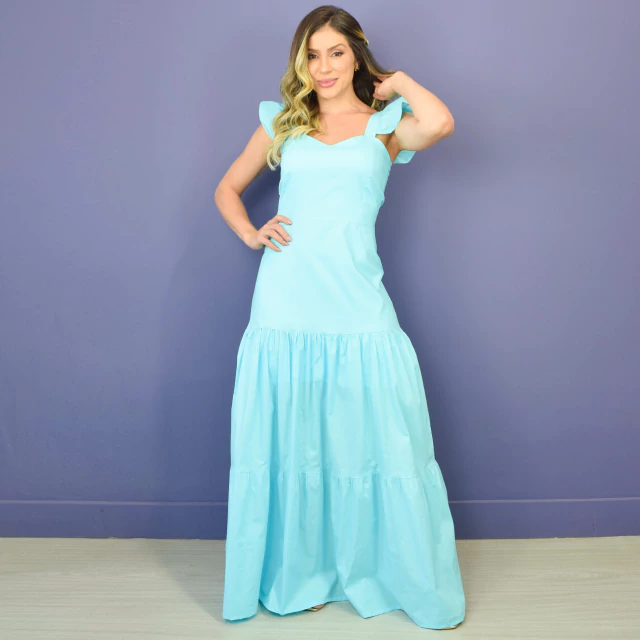 Vestido adulto longo perfeito para qualquer ocasião. Tem mangas fixas com babadinho, fecho de zíper nas costas e detalhes na saia que dão todo um charme ao modelo que vai te proporcionar elegância.
