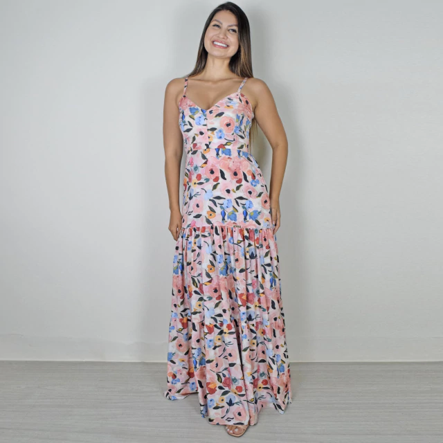 Vestido adulto longo na sedinha, tecido leve. Caimento perfeito no corpo com costas em lastex. Alças reguláveis de fácil ajuste que torna o modelo mais delicado. Detalhe decotado no busto finalizando esse modelo com sofisticação.
