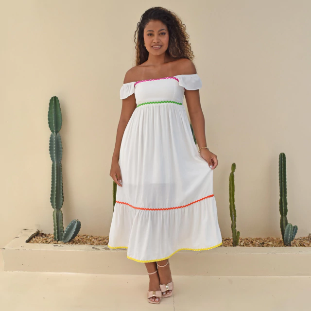 Vestido adulto supermidi, alças de elastico com babadinho e opção ombro a ombro, excelente opção para mamães em fase de amamentação. Costas com lastéx que garantem maior conforto e encaixe perfeito do modelo no corpo. Detalhes de sianinhas coloridas que tornam o modelo ainda mais delicado e charmoso.