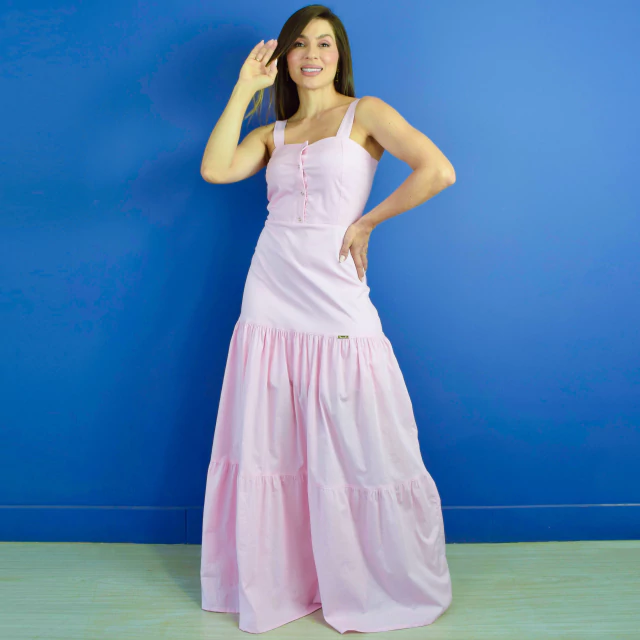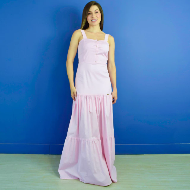 Vestido longo no tricoline rosa bebê. Costas com zíper garantindo o encaixe perfeito do modelo ao corpo. Alças fixas largas e detalhes de botões no busto que dão um toque de sofisticação e delicadeza ao modelo, perfeito para mamães em estágio de amamentação.