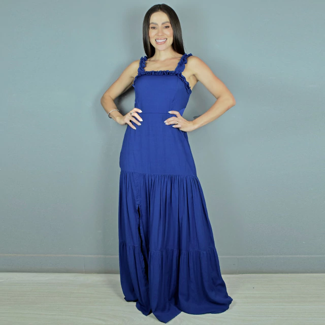 Vestido adulto longo perfeito para qualquer ocasião. Tem alças de elástico com um babadinho que se estende por toda parte frontal e opção ombro a ombro, costas com lastex garantindo o encaixe perfeito do modelo no corpo e fenda frontal na saia que dá todo um charme ao modelo que vai te proporcionar elegância e sofisticação.