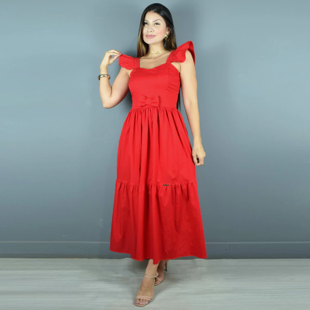 Vestido adulto supermidi no viscolinho vermelho, costas com zíper invisível mantendo a delicadeza do modelo. Alças fixas com babadinhos e laço fixo frontal finalizando esse lookinho todo especial.