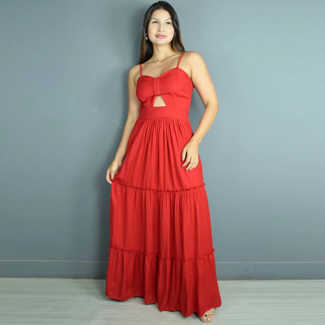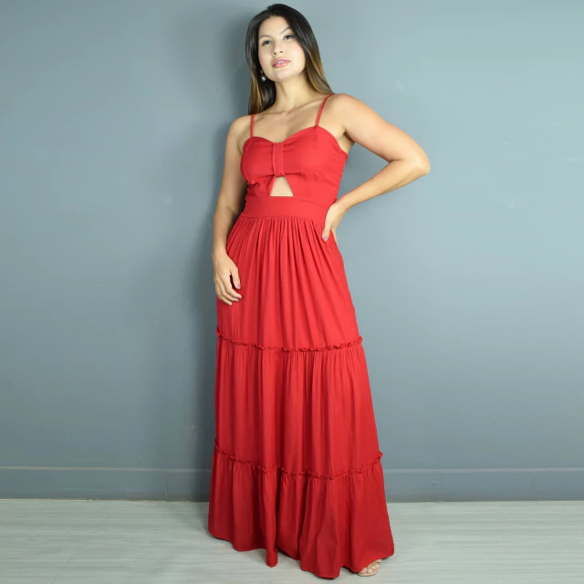 Vestido adulto longo todo no viscolinho vermelho. Com costas em lastex proporcionando qualidade maior durante o uso, uma alcinha regulável confortável que traz sensação de segurança, detalhe franzido externo na saia e abertura frontal que dá maior elegancia e charme ao modelo.