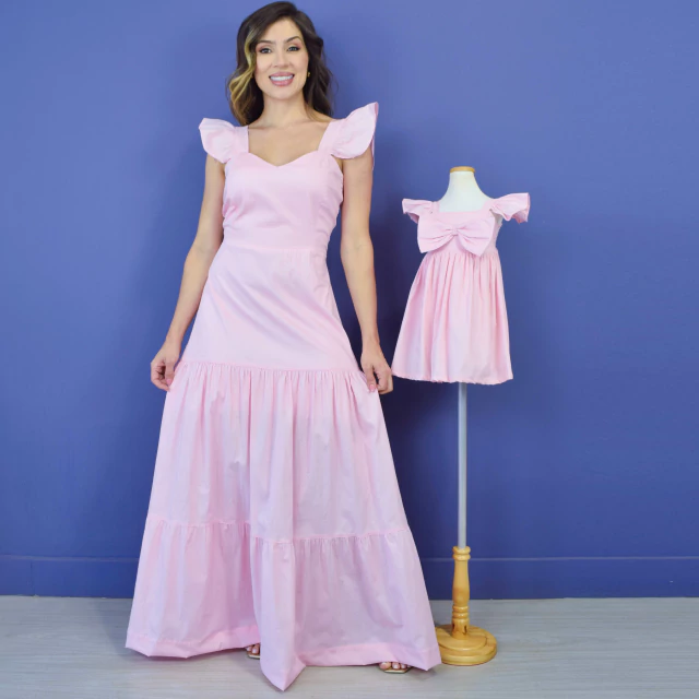Este kit vestidos maravilhoso mãe e filha contém um vestido adulto longo perfeito para qualquer ocasião. Tem alças fixas com babadinho, fecho de zíper nas costas e detalhes na saia que dão todo um charme ao modelo que vai te proporcionar elegância. E vestido infantil com costas em lastex que garante maior conforto, alça fixa com babadinhos e um lindo laço bem na frente pra dar um toque de charme ao modelo.